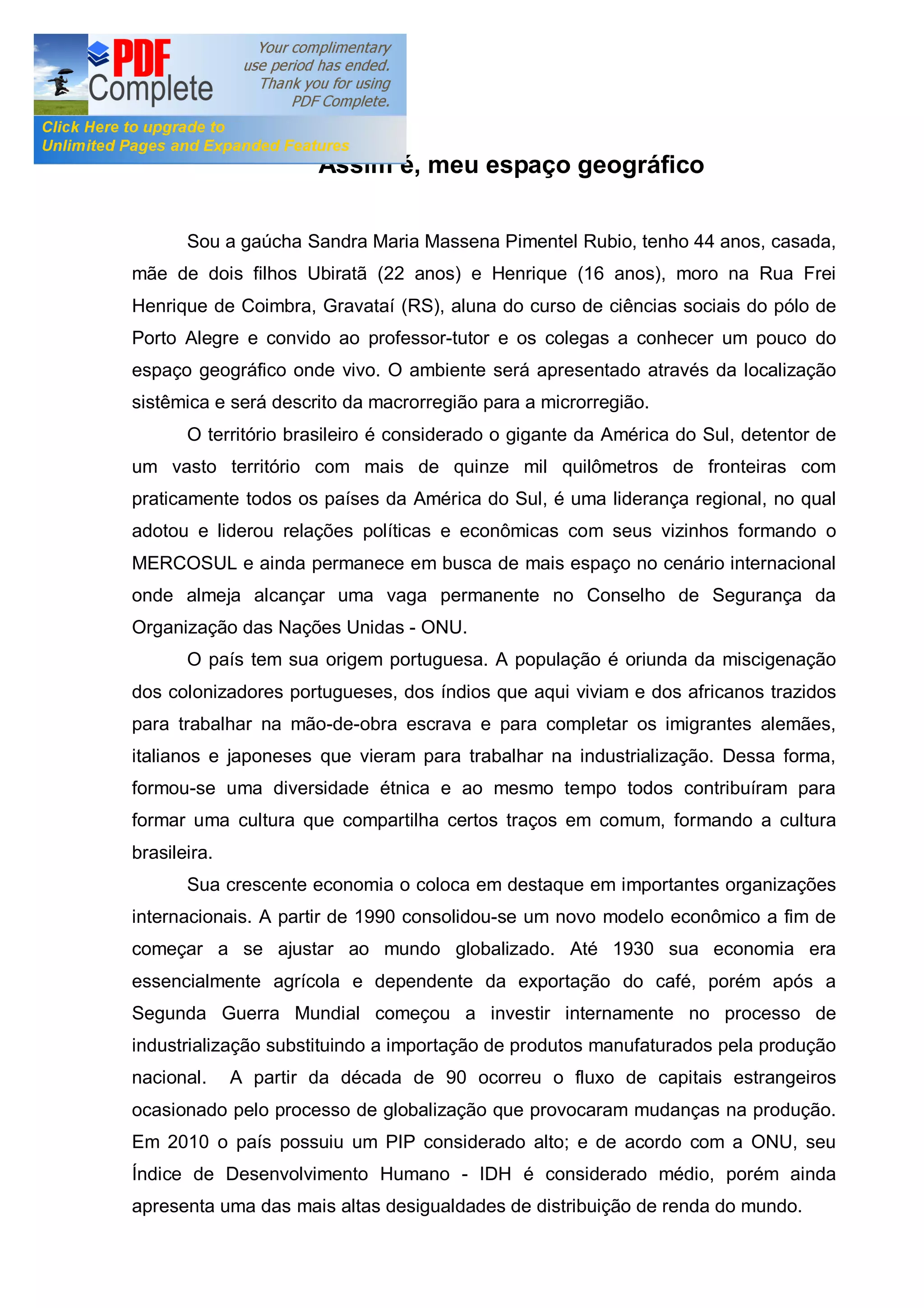 O documento descreve a região onde a autora vive, o Rio Grande do Sul no Brasil. Ela fornece detalhes sobre a história, geografia, clima, economia e cultura do estado e da cidade de Gravataí, onde mora atualmente. A autora explica como o Rio Grande do Sul evoluiu de uma economia agrícola para um importante polo industrial no sul do Brasil.