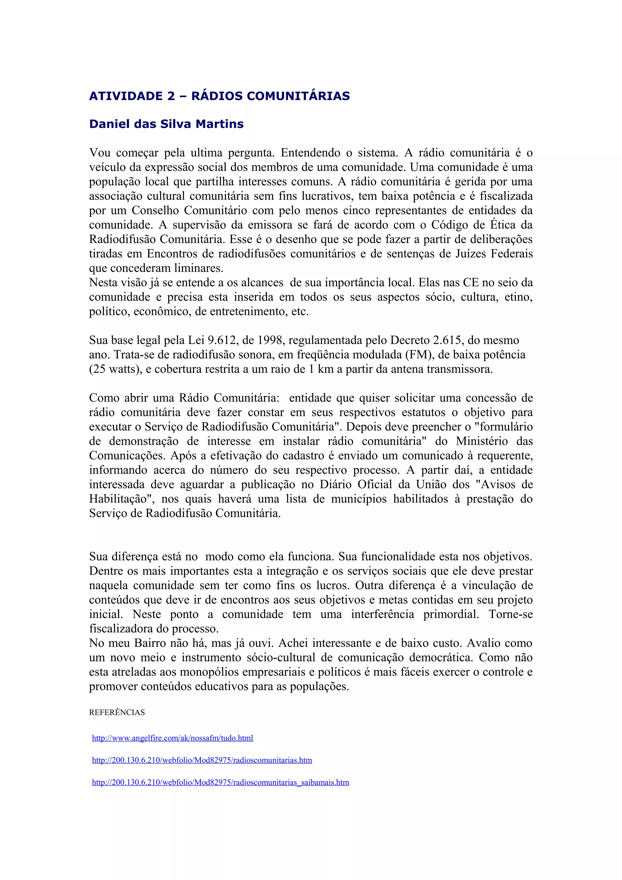 Uma rádio comunitária é gerida por uma associação cultural sem fins lucrativos para expressar os interesses de uma comunidade local. Ela deve ter um Conselho Comunitário de 5 membros e seguir um Código de Ética. Para abrir uma rádio comunitária, uma entidade deve alterar seus estatutos e preencher um formulário junto ao Ministério das Comunicações.