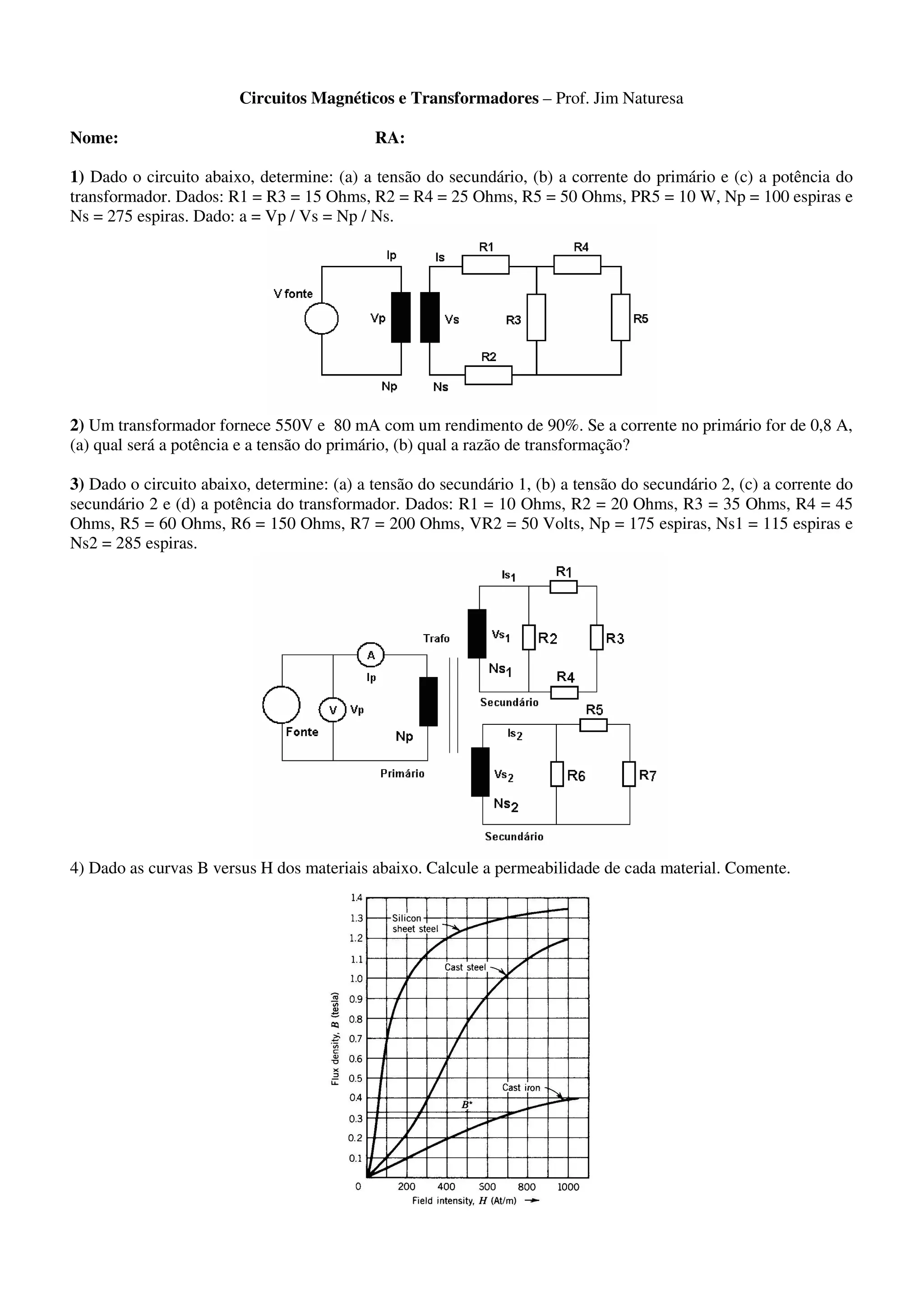 Este documento apresenta 4 problemas sobre circuitos magnéticos e transformadores. O primeiro problema pede para calcular a tensão, corrente e potência de um transformador dado seu circuito e especificações. O segundo problema pede para calcular a potência, tensão e razão de transformação de um transformador com rendimento e correntes especificadas. O terceiro problema pede para calcular tensões, correntes e potência de um transformador com múltiplos secundários dado seu circuito. O quarto problema pede para calcular a permeabilidade de diferentes materiais magnéticos com base