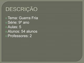 O documento descreve uma sequência didática sobre a Guerra Fria com 54 alunos do 9o ano. Os alunos foram divididos em 6 grupos para pesquisar temas como o Plano Marshall e a Corrida Armamentista usando uma webquest e apresentá-los em PowerPoint para a turma, que posteriormente publicou as apresentações no blog da turma.