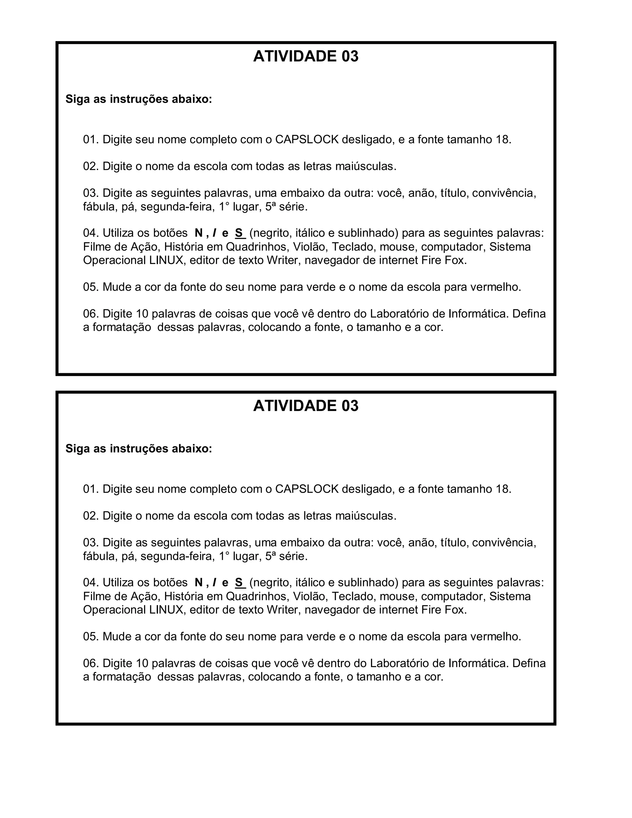 Este documento fornece instruções para uma atividade em que o aluno deve digitar seu nome, nome da escola e uma lista de palavras com formatações específicas de fonte, tamanho e cor.