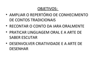 Este plano de aula tem como objetivo ensinar aos alunos a lenda da Iara através da leitura de um livro, assistindo a um filme e desenhando a história. A aula será dividida em duas partes, na primeira os alunos ouvirão a professora ler o livro e recontar a lenda, e na segunda parte eles assistirão ao filme e desenharão a história no computador para depois compartilharem.