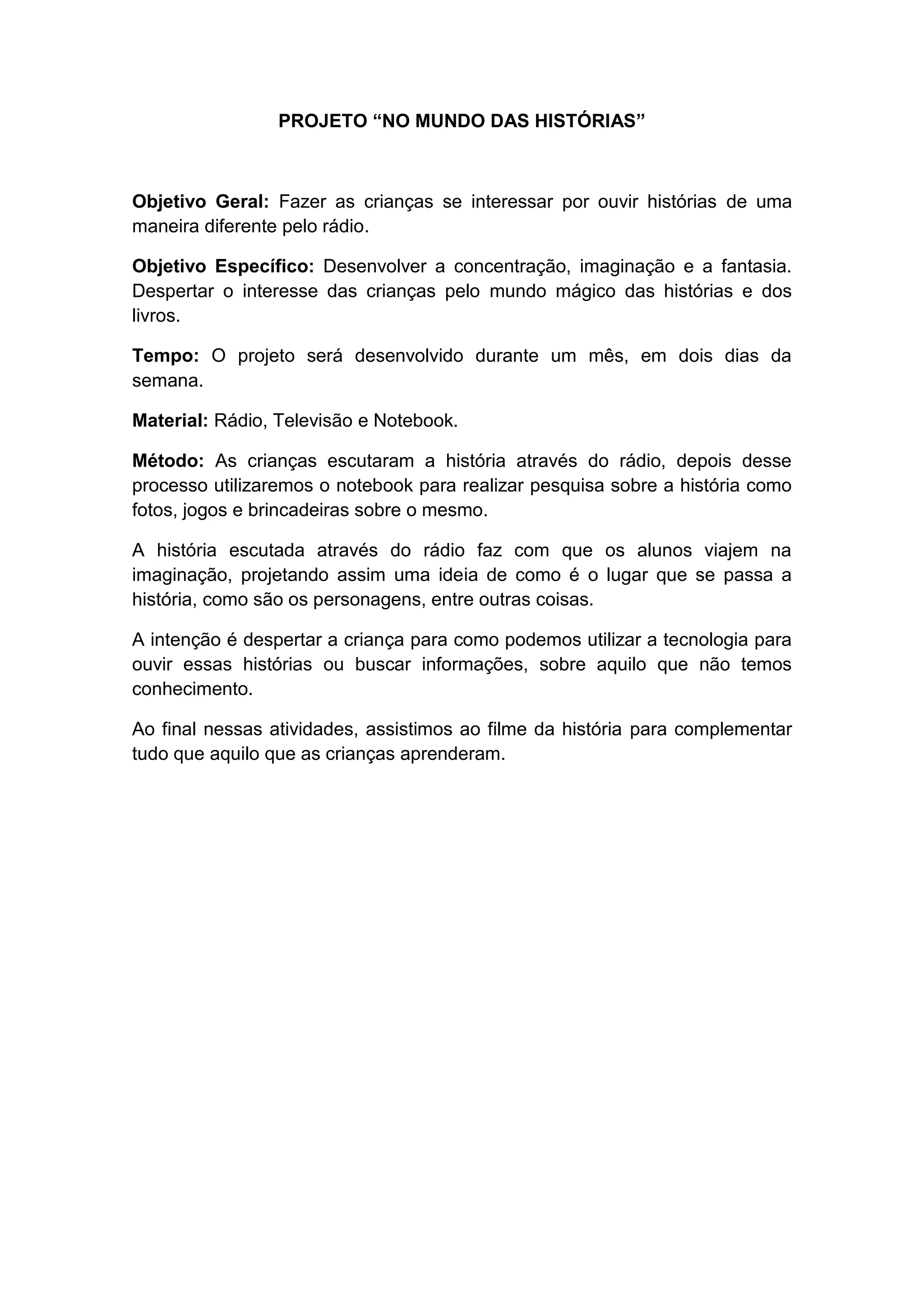 O projeto "No Mundo das Histórias" tem como objetivo fazer crianças se interessarem por ouvir histórias de forma diferente pelo rádio, desenvolvendo sua imaginação e fantasia. Durante um mês, as crianças irão escutar histórias pelo rádio e depois pesquisar sobre elas em um notebook, antes de assistir ao filme da história.