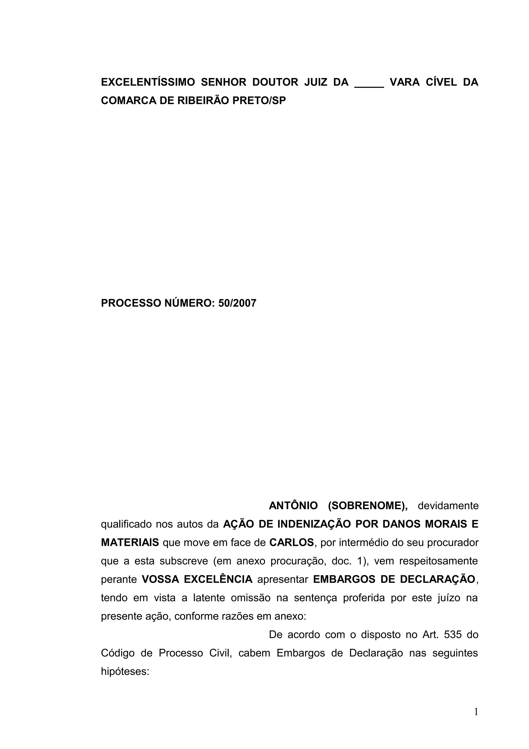 Antônio moveu uma ação de indenização por danos morais e materiais contra Carlos. Na sentença, o juiz analisou os danos materiais mas omitiu-se sobre os danos morais. Antônio então propôs Embargos de Declaração para sanar esta omissão e requerer que os danos morais sejam julgados procedentes.