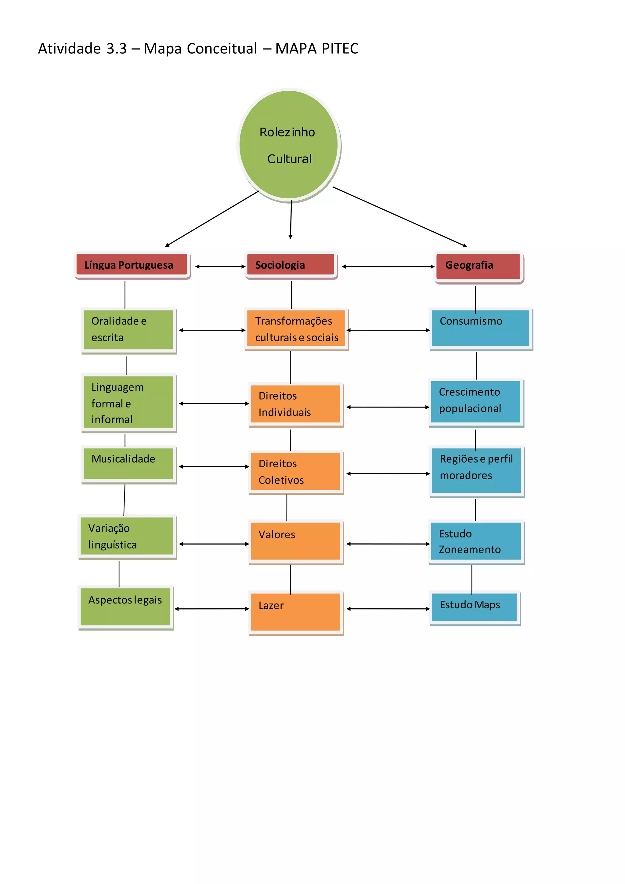 O documento apresenta um mapa conceitual sobre o rolezinho, abordando seus aspectos culturais, sociais, linguísticos e legais, bem como seu impacto no lazer, crescimento populacional e zoneamento de regiões.