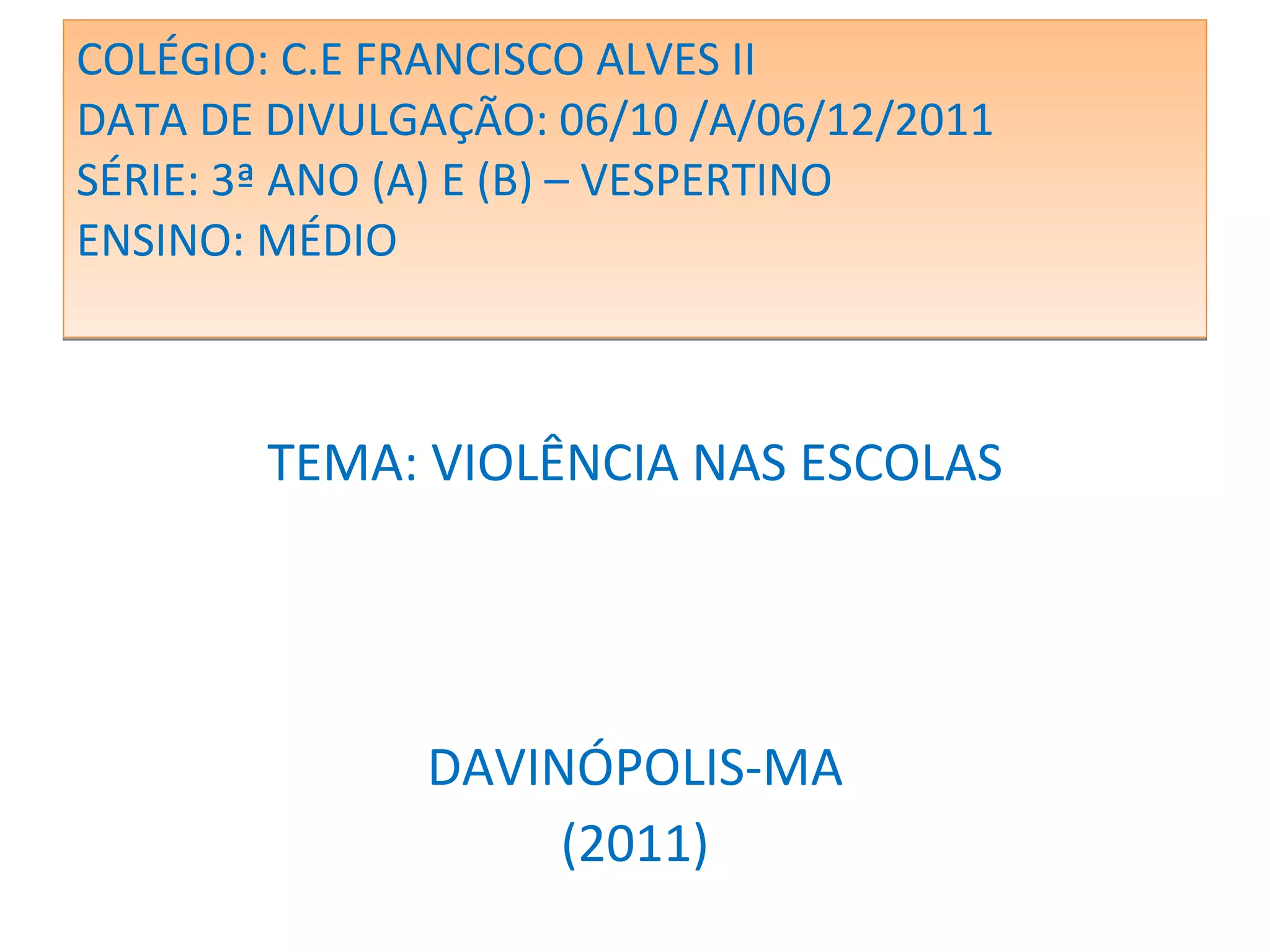 1. O documento descreve um projeto desenvolvido por alunos do 3o ano do ensino médio do Colégio C.E Francisco Alves II sobre educar para prevenir a violência entre estudantes nas escolas.