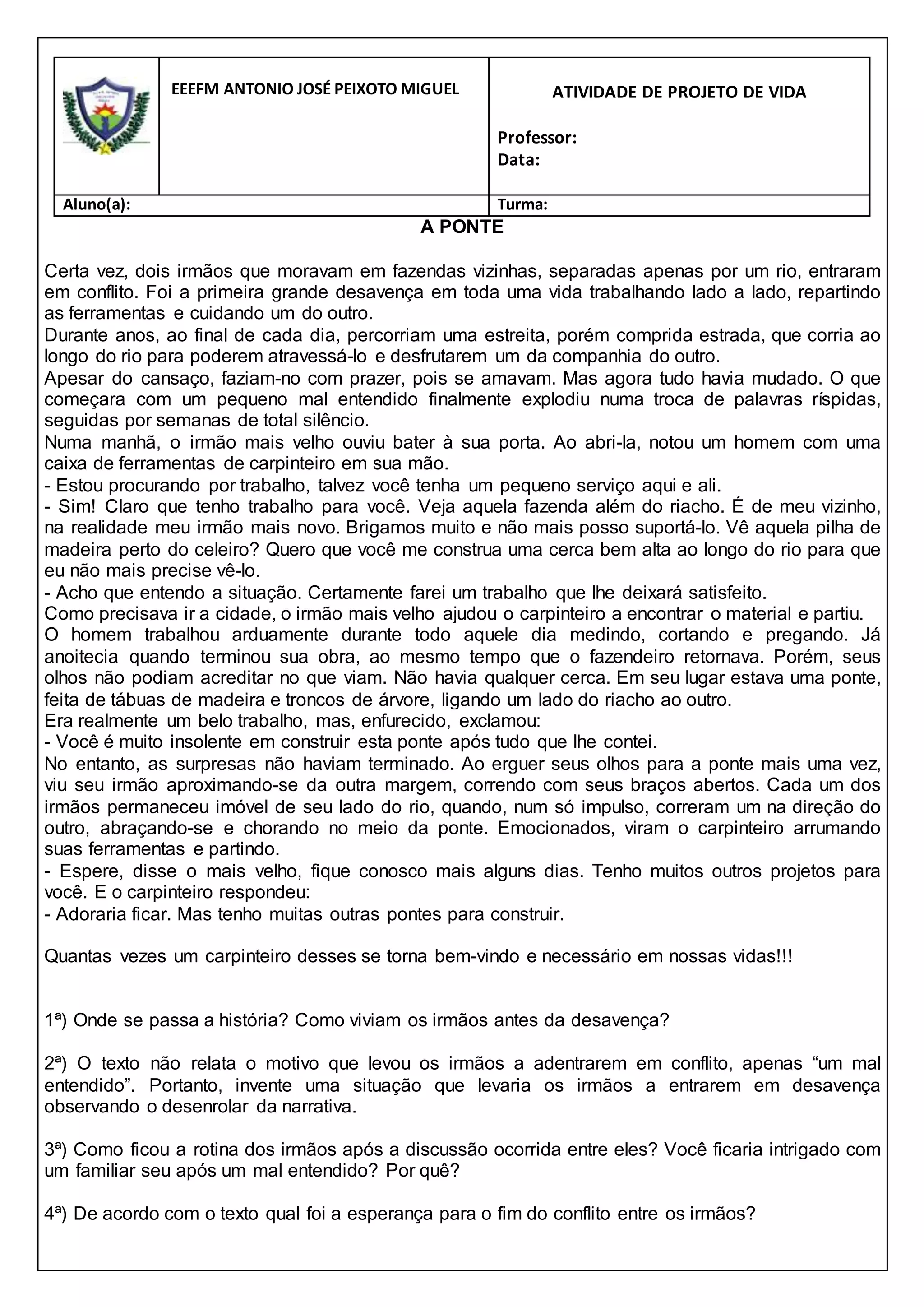 10ª) Que lição podemos tirar dessa linda história: “A ponte”.