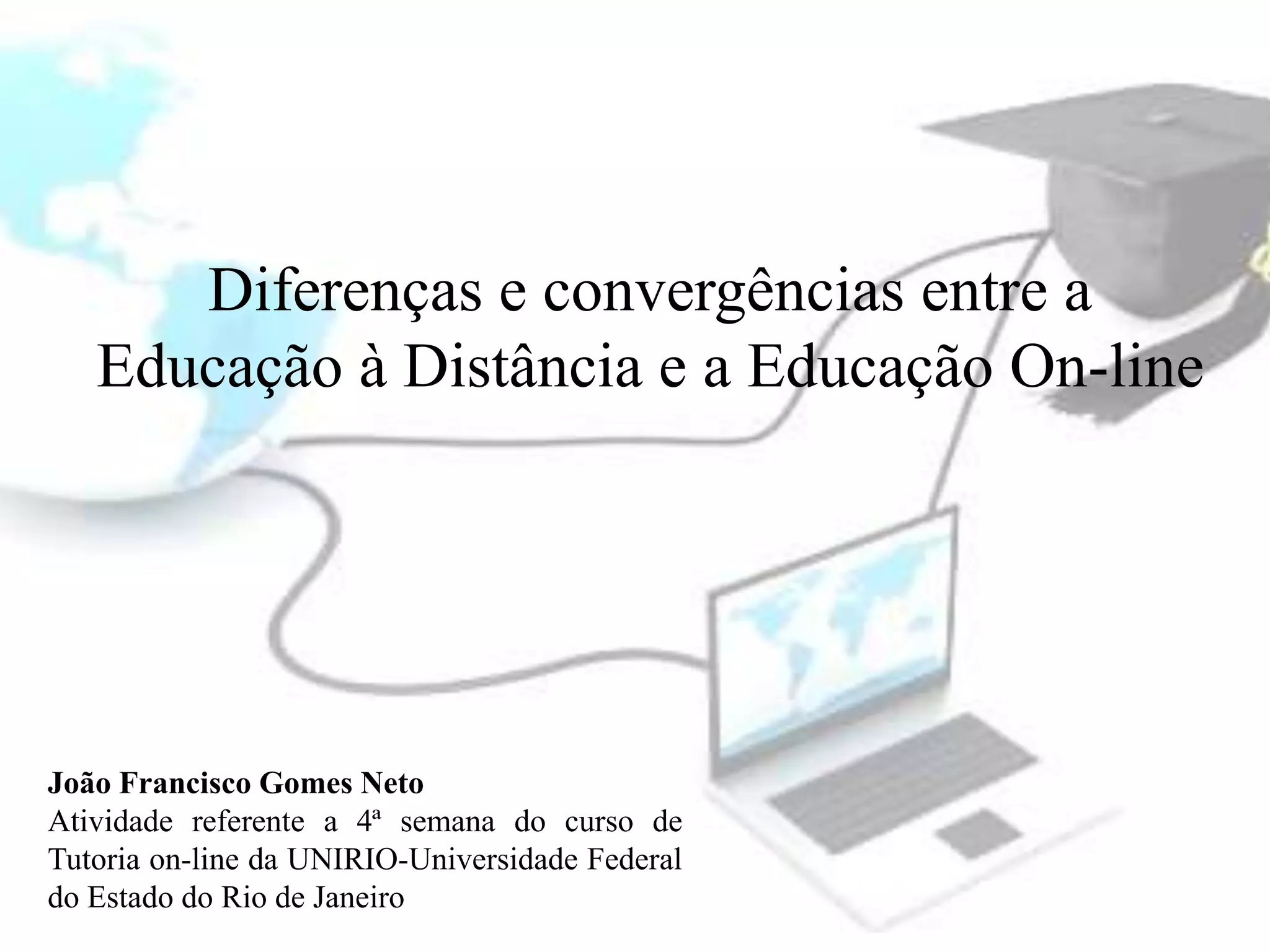 1) O documento discute as diferenças e convergências entre educação a distância e educação on-line, explicando que a educação on-line envolve o uso da internet para atividades educacionais ao passo que educação a distância não requer necessariamente o uso da internet.