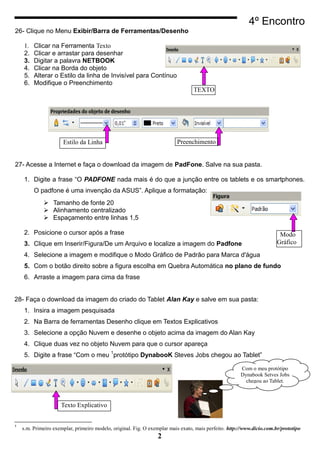 O documento fornece instruções sobre como formatar texto, inserir imagens e objetos em um documento do Word. Instruções incluem como alterar formatação de fonte de texto, adicionar objetos de fontwork e desenho, posicionar imagens e adicionar nuvens de texto.