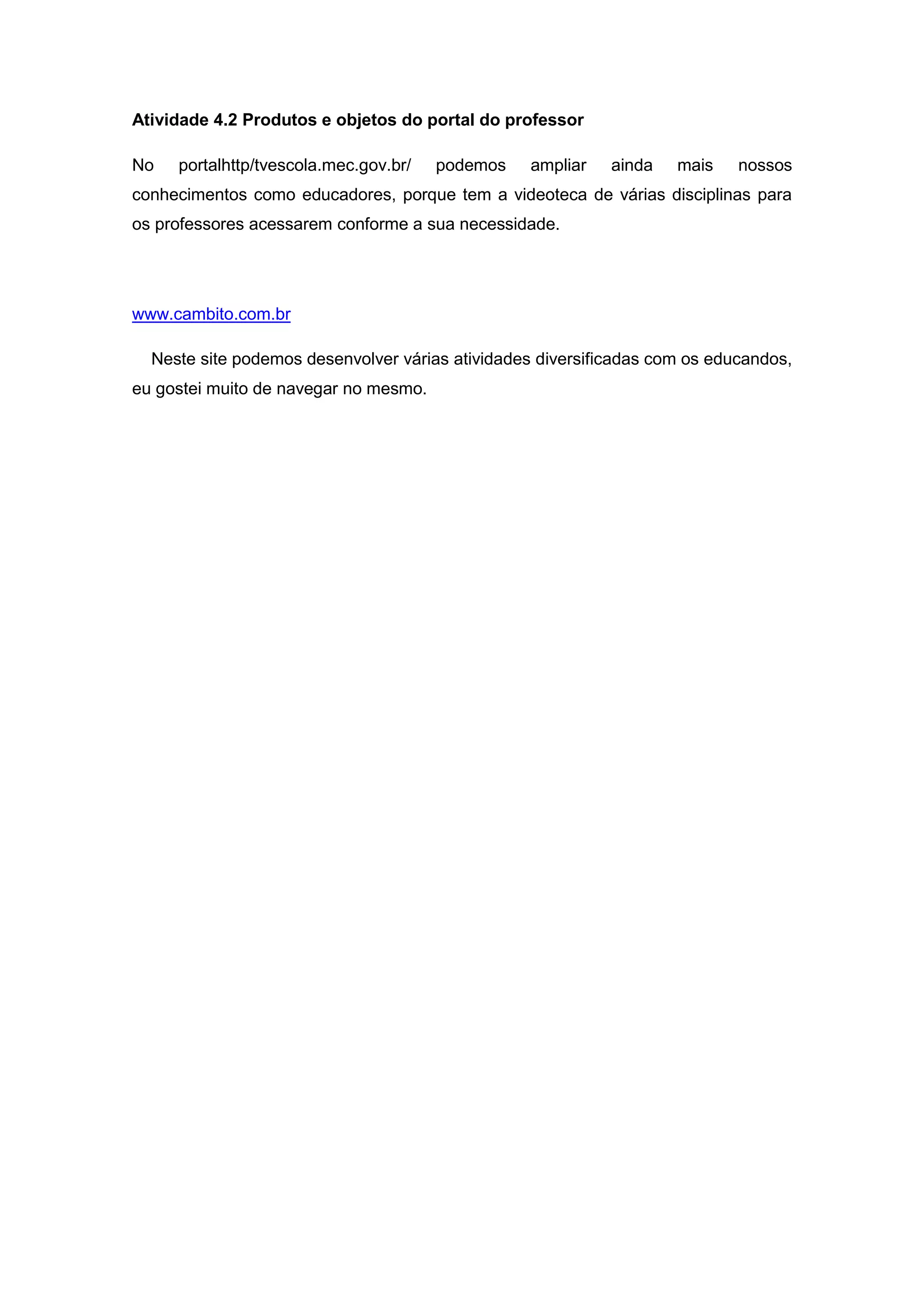 O documento descreve dois sites educacionais que fornecem recursos para professores e estudantes. O portal http/tvescola.mec.gov.br oferece uma videoteca com vídeos de diferentes disciplinas para professores acessarem de acordo com suas necessidades. O site www.cambito.com.br permite desenvolver várias atividades diversificadas com estudantes.