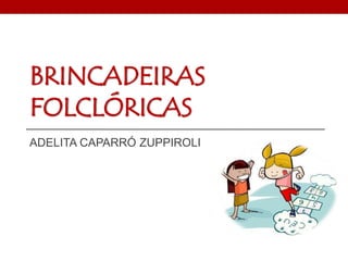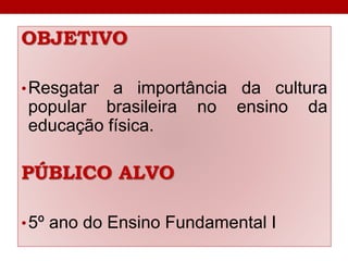 Este documento discute brincadeiras folclóricas populares brasileiras e seu valor para o desenvolvimento de crianças e a educação física. Ele descreve objetivos de resgatar a cultura popular brasileira e seu público-alvo de crianças do 5o ano do ensino fundamental. Em seguida, explica brevemente as origens das brincadeiras populares e seus benefícios para o desenvolvimento físico e não-físico das crianças, e então descreve as regras de seis brincadeiras específicas - Amarelinha,