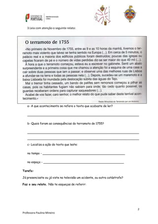 Este documento apresenta uma lição sobre meios de comunicação para estudantes. Contém perguntas sobre a evolução histórica dos meios de comunicação, como o telégrafo, rádio, telefone e internet. Também pede aos estudantes para descrever um acidente ou catástrofe que testemunharam através da mídia ou pessoalmente.