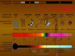 O documento discute diferentes tipos de ondas eletromagnéticas, incluindo suas propriedades e aplicações. Explica que as ondas eletromagnéticas se propagam através do espaço ou meios e oscilam entre campos elétricos e magnéticos. Também descreve o espectro eletromagnético, listando exemplos como raios gama, raios X, ultravioleta, visível e infravermelho.