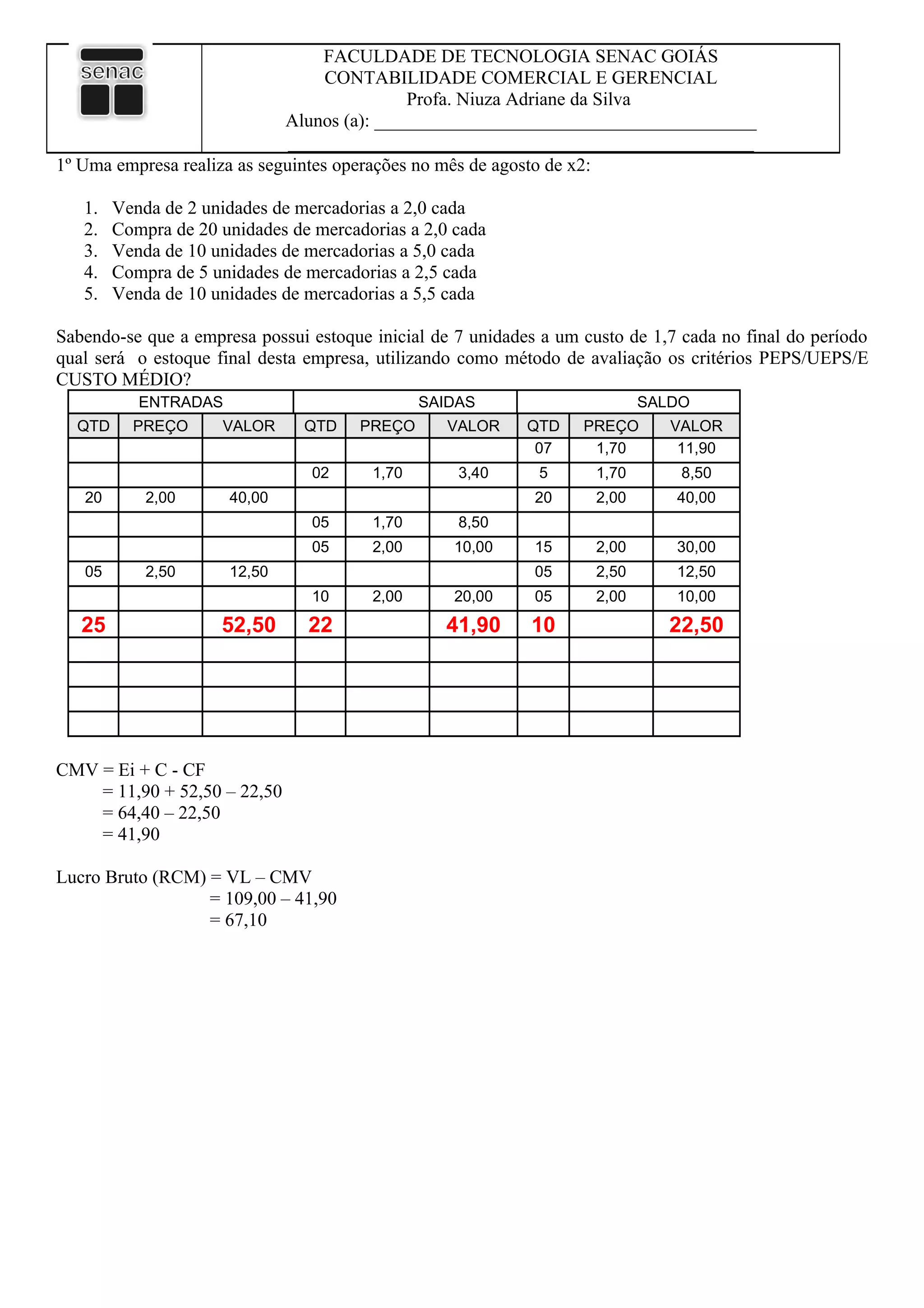 O documento apresenta 4 situações de controle de estoque utilizando os métodos PEPS, UEPS e custo médio. Para cada situação são fornecidos dados sobre compras e vendas realizadas e os alunos devem preencher quadros para calcular os estoques finais pelos diferentes métodos.