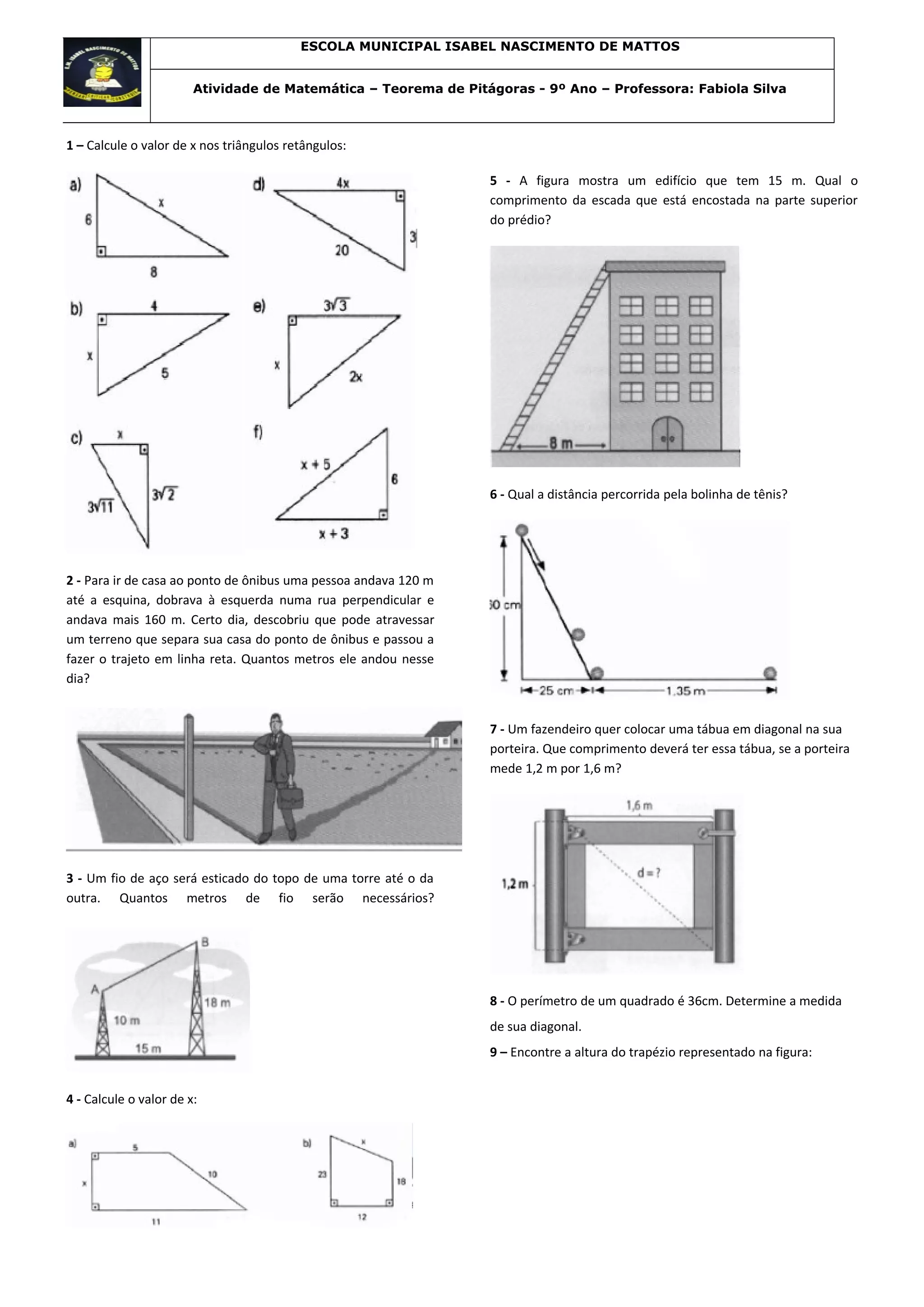O documento apresenta 9 exercícios de matemática sobre cálculos envolvendo triângulos retângulos, distâncias percorridas, comprimentos de fios, escadas e diagonais. Os exercícios abordam conceitos como teorema de Pitágoras, perímetro, área e propriedades de figuras planas.