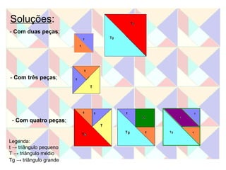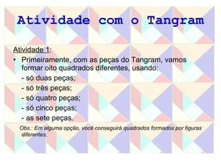 Este documento apresenta duas atividades com o Tangram. A primeira pede para formar oito quadrados usando diferentes números de peças e calcular a área de cada um. A segunda calcula a área de cada peça do Tangram e usa essas áreas para calcular a área dos quadrados formados na primeira atividade.