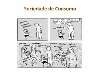 O documento discute a sociedade de consumo e o marketing. A oferta excede a demanda nessas sociedades, levando a estratégias agressivas de marketing para vender produtos. O marketing procura o equilíbrio entre oferta e demanda e ajudar os clientes.