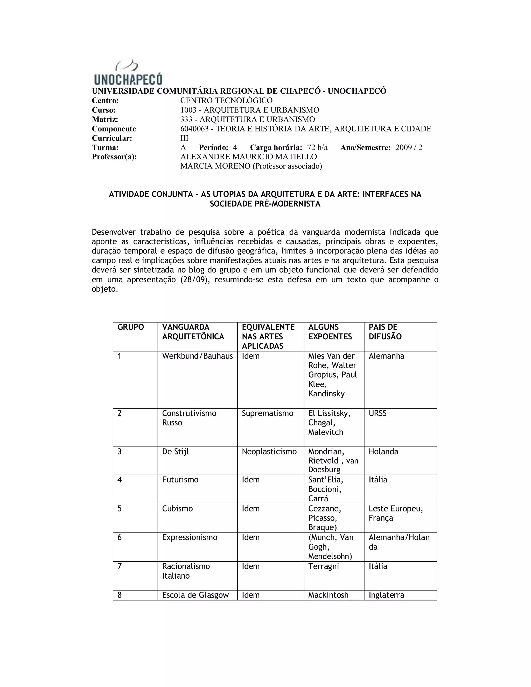 O documento descreve uma atividade conjunta sobre as utopias da arquitetura e arte pré-modernistas. Os alunos deverão pesquisar uma vanguarda modernista, sintetizando a pesquisa em um blog e objeto funcional. A apresentação incluirá uma defesa resumida em texto acompanhando o objeto. O documento lista 8 grupos de vanguardas arquitetônicas e artísticas equivalentes, com alguns expoentes e países de difusão.