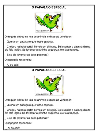 O freguês procura um papagaio especial na loja de animais. O vendedor oferece um papagaio bilíngue que fala inglês ou francês dependendo de qual patinha ele levanta. Quando o freguês pergunta o que acontece se ele levantar as duas patinhas, o próprio papagaio responde "Aí eu caio!".