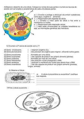 O documento discute as características de seres vivos a nível celular e seus níveis de organização. Ele apresenta questões sobre seres vivos unicelulares e pluricelulares, procariotas e eucariotas, autótrofos e heterótrofos, aeróbios e anaeróbios. O documento também descreve as partes da célula e suas funções.