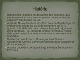 Itapetininga foi um ponto de descanso para tropeiros no século 18 e oficialmente fundada em 1770. Sua economia é baseada na agricultura e indústria, com destaque para a produção de moveis e têxtil. O "bolinho de frango" é um prato típico declarado patrimônio cultural da cidade.