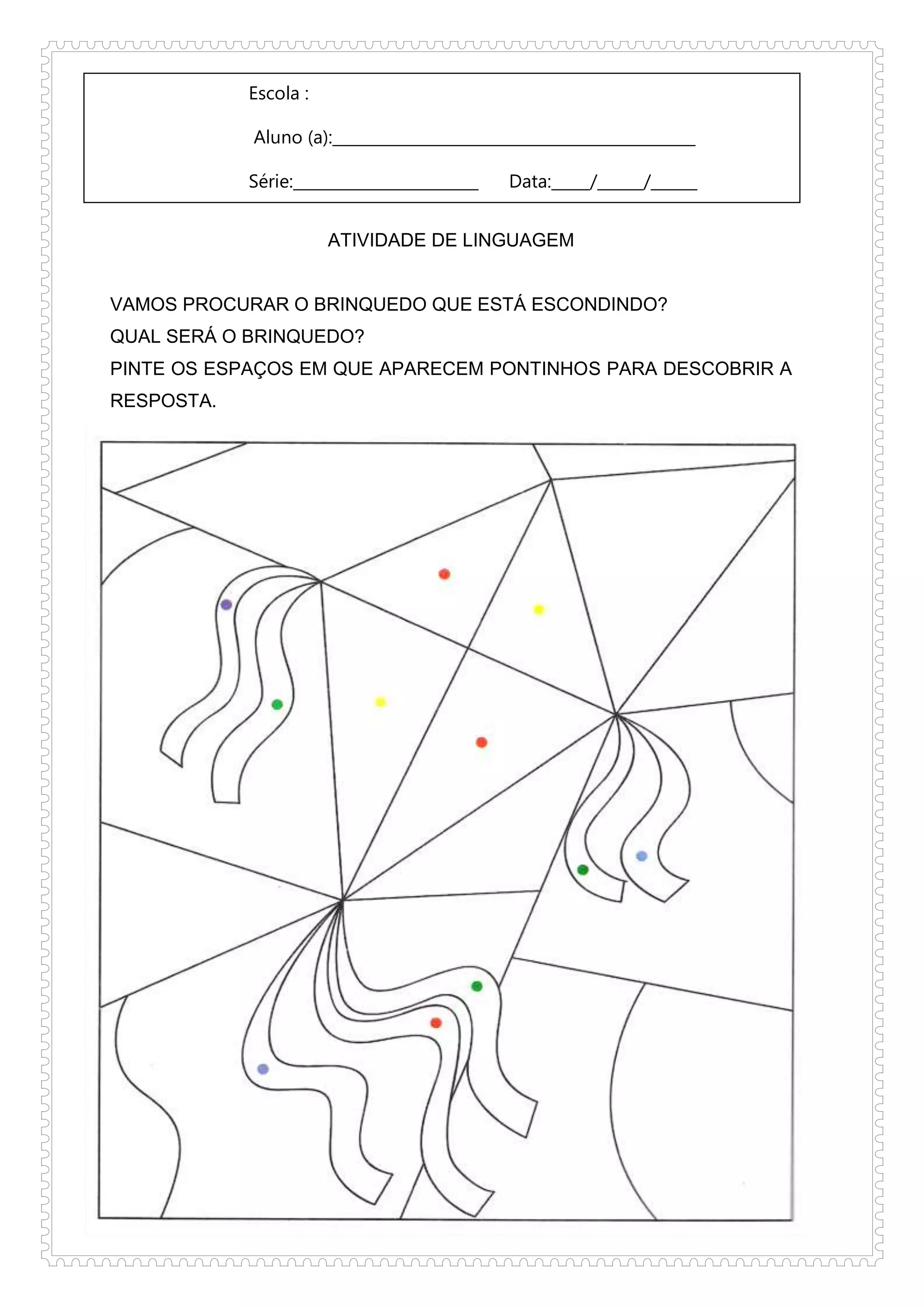 Este documento contém 5 atividades escolares para alunos: 1) descobrir um brinquedo escondido pintando pontos, 2) traçar o caminho de uma joaninha até um jardim, 3) cantar e desenhar uma canção infantil, 4) identificar cestas iguais e diferentes, 5) colar figuras de coisas que gosta de ver após uma pesquisa.