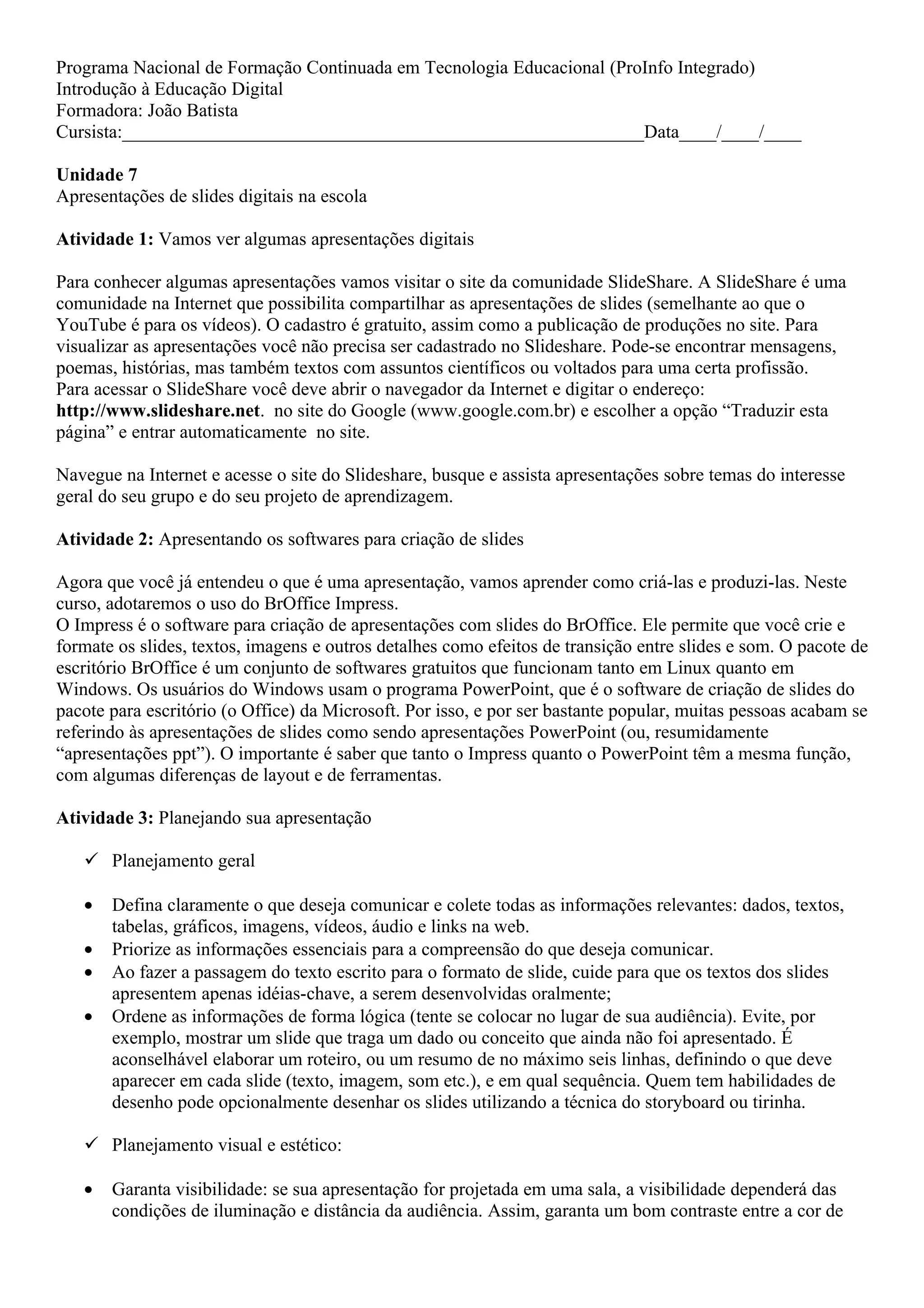 O documento discute o uso de apresentações digitais na escola. Ele fornece instruções sobre como criar apresentações usando o software BrOffice Impress, incluindo como adicionar slides, imagens, efeitos de transição e compartilhar apresentações online. As atividades guiam os alunos na criação e edição de uma apresentação sobre um tópico de sua escolha.