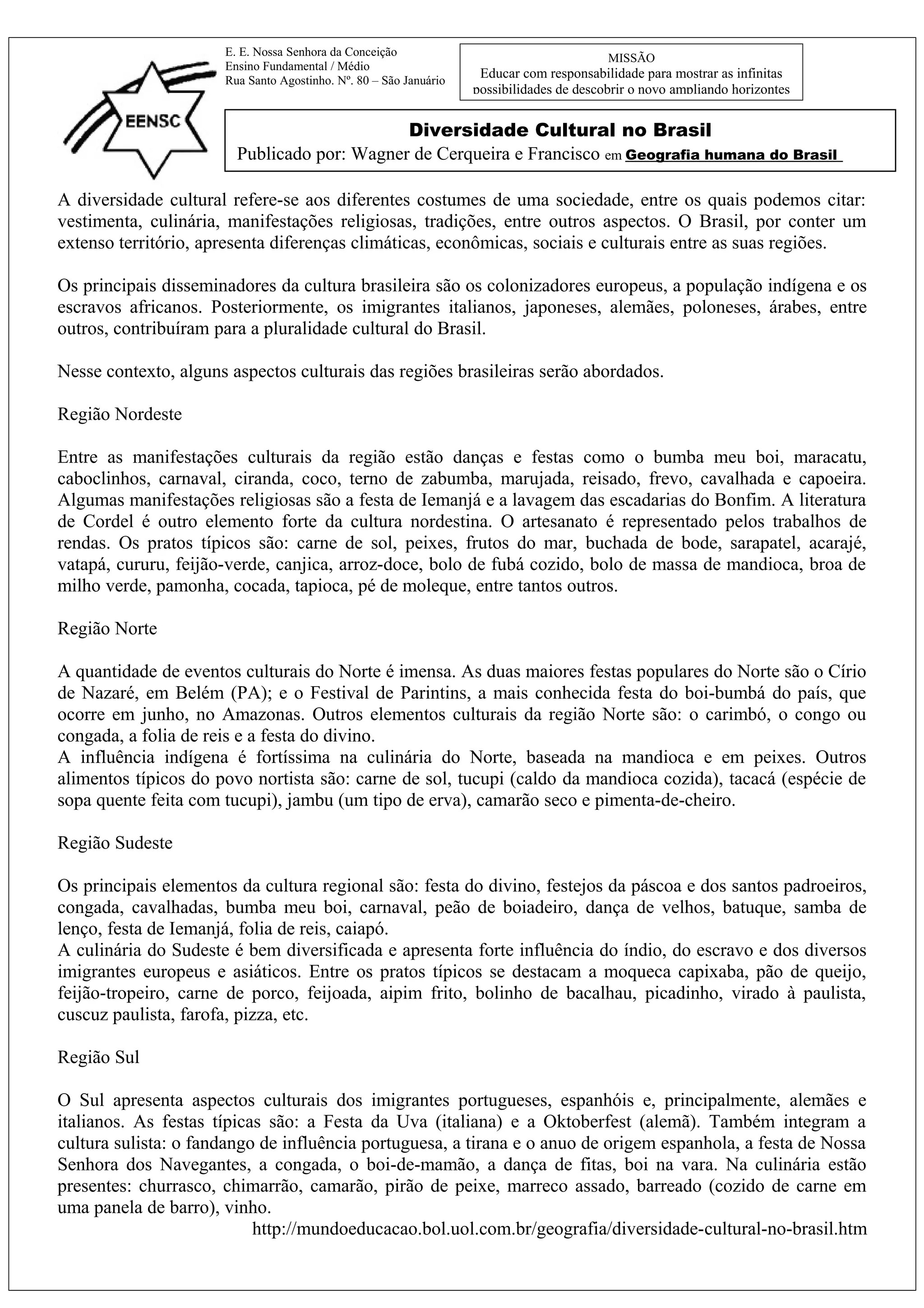 O documento discute a diversidade cultural nas diferentes regiões do Brasil, incluindo danças, festividades, culinária e tradições religiosas. A cultura nordestina é caracterizada por danças como bumba meu boi e manifestações como o carnaval. No norte, destacam-se o Círio de Nazaré e o Festival de Parintins, além da influência indígena na culinária. O sudeste apresenta forte influência indígena, africana e européia, enquanto o sul é marcado por festas como a Okto