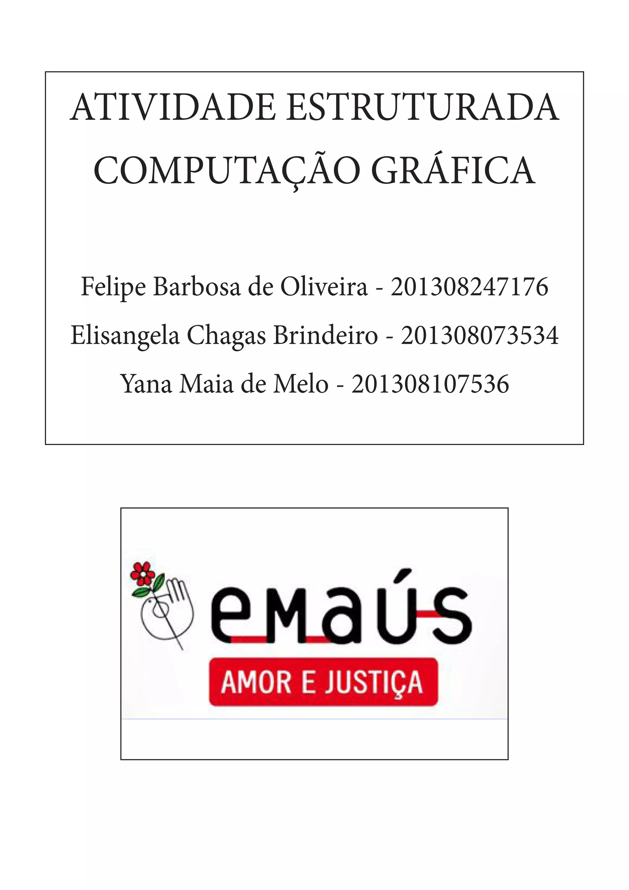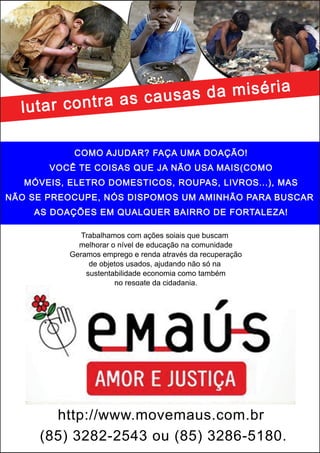 O documento descreve uma ONG chamada Movimento Emaús Amor e Justiça que atua há 20 anos na comunidade Pirambu em Fortaleza, Ceará. A ONG trabalha com ações sociais para melhorar a educação e gera emprego e renda através da recuperação de objetos usados, atendendo mais de 400 crianças e jovens por ano. Eles escolheram panfletos e cartazes para divulgar suas causas e também buscam divulgação em jornais.