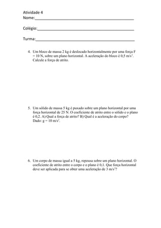 Este documento apresenta 7 exercícios de física que envolvem cálculos de aceleração, força de atrito e distância percorrida por corpos em movimento horizontal sobre superfícies. Os problemas abordam conceitos como massa, força aplicada, coeficiente de atrito e aceleração para determinar grandezas como força de atrito, aceleração e distância percorrida.