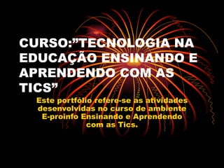 Este portfólio descreve as atividades realizadas no curso "Tecnologia na Educação: Ensinando e Aprendendo com as TICs". O curso incluiu discussões e projetos sobre o uso de tecnologia na educação, internet, hipertexto e currículo. O portfólio registra as reflexões e trabalhos da aluna em cada módulo do curso.