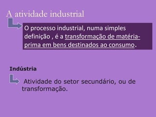 1) O documento descreve os tipos de indústria e sua evolução histórica.