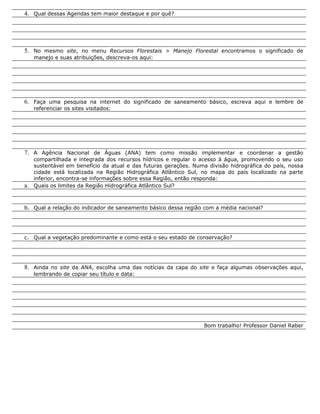 O documento fornece instruções para que os alunos pesquisem sites de órgãos ambientais brasileiros e respondam perguntas sobre assuntos como preservação ambiental, Agenda 21, manejo florestal e recursos hídricos. Os alunos devem acessar sites como o Ministério do Meio Ambiente, IBAMA e Agência Nacional de Águas e usar informações desses sites para responder às oito perguntas listadas no documento.