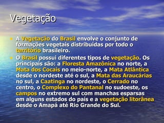Este documento descreve uma aula planejada sobre a vegetação, hidrografia e climas do Brasil. A aula tem como objetivo fazer os alunos conhecerem a diversidade desses aspectos geográficos no território brasileiro e terá a duração de três aulas, abordando os principais biomas de vegetação do país, o clima influenciado pelas massas de ar, e os recursos hídricos como bacias hidrográficas e rios.