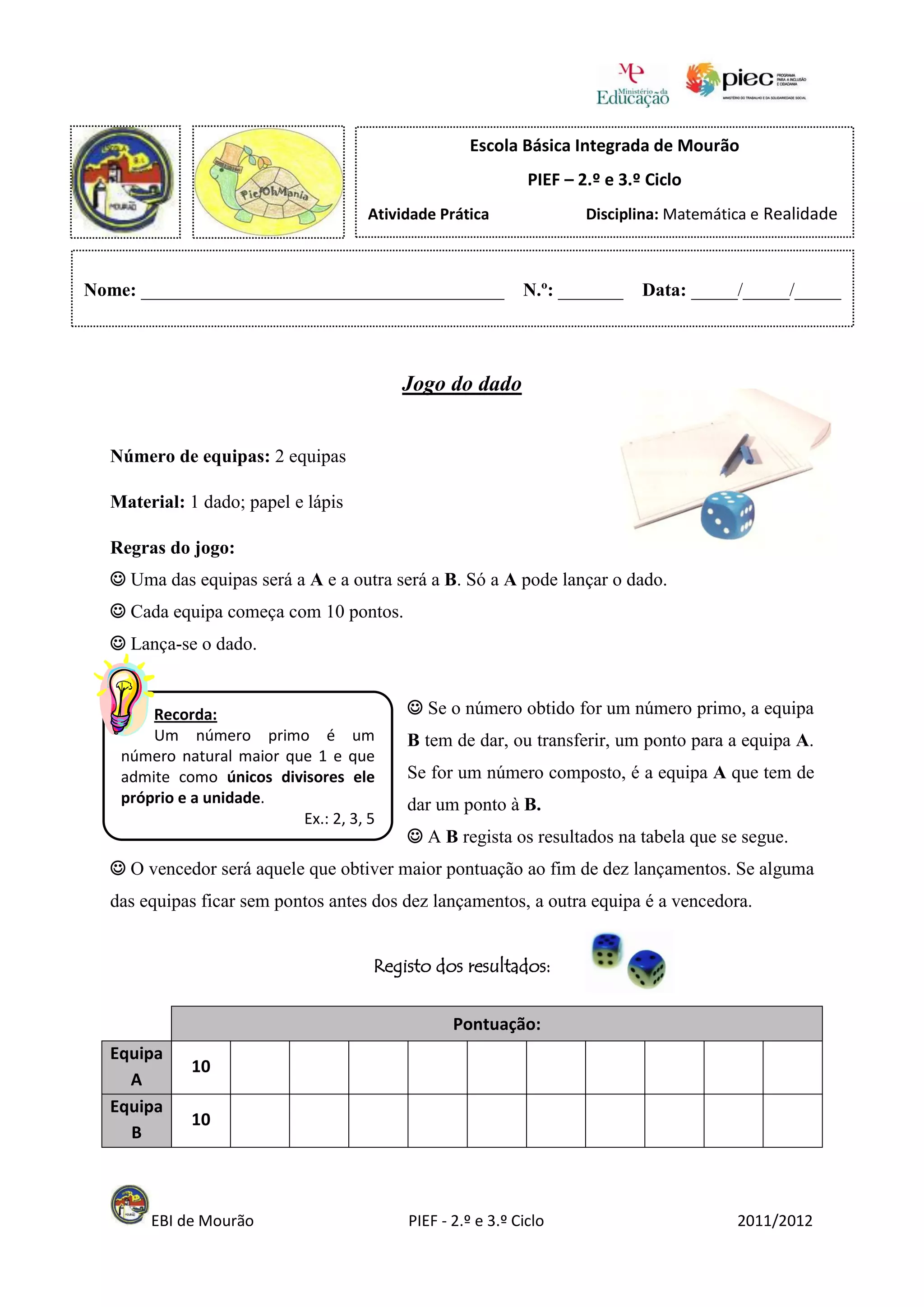 Este documento descreve um jogo de dados entre duas equipas, A e B. Cada equipa começa com 10 pontos e lançam um dado por vez. Se sair um número primo, a outra equipa ganha um ponto; se sair um número composto, a outra equipa perde um ponto. O objetivo é acumular mais pontos em 10 lançamentos. Antes de jogar, os alunos devem responder perguntas sobre probabilidades relacionadas com os resultados possíveis de um lançamento de dado.