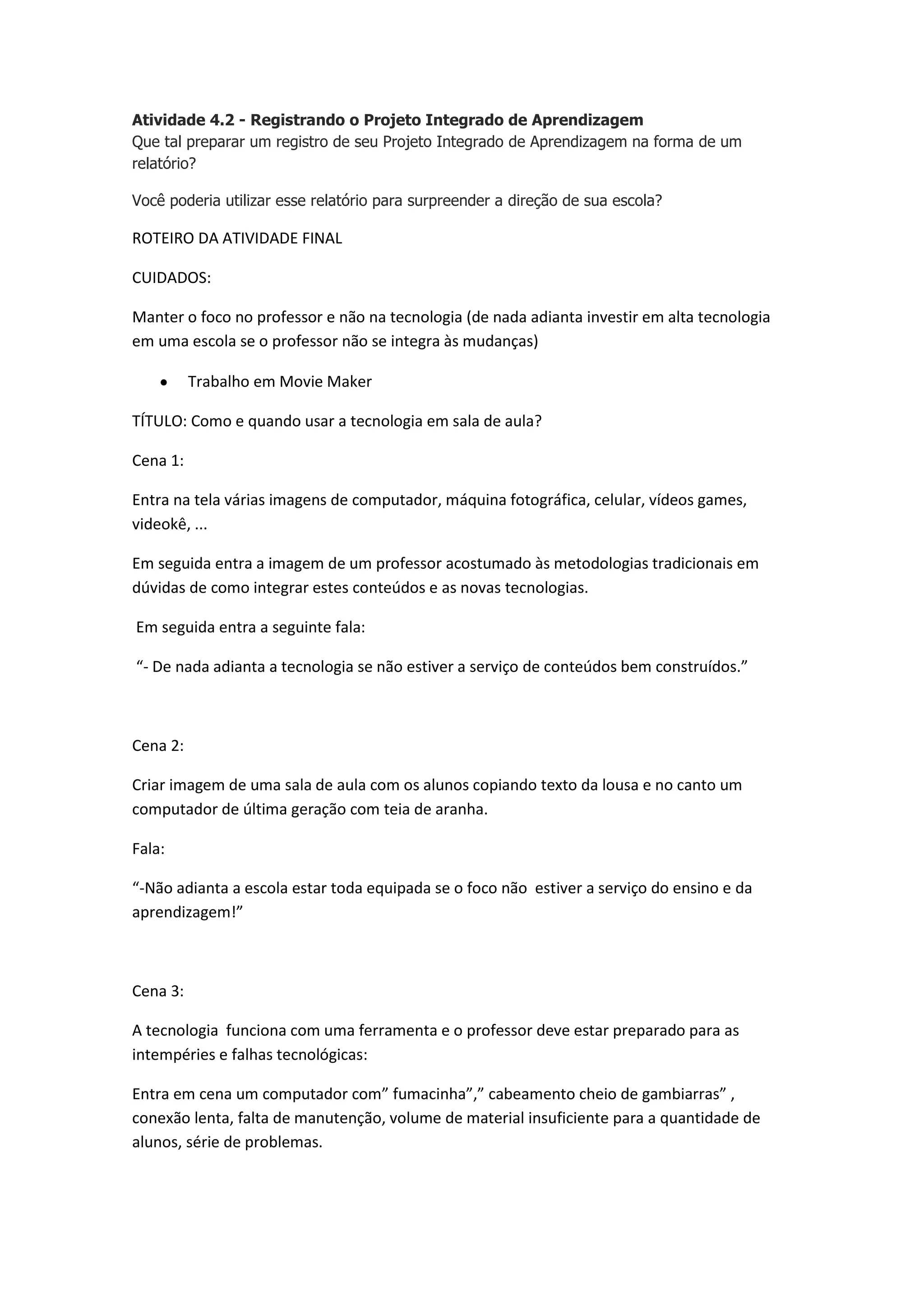 O documento discute como o professor pode integrar novas tecnologias no ensino de forma efetiva. Ele sugere que a tecnologia deve ser usada para apoiar os conteúdos, não substituí-los, e que as escolas devem capacitar os professores e manter os equipamentos para que a tecnologia funcione como uma ferramenta de aprendizagem.