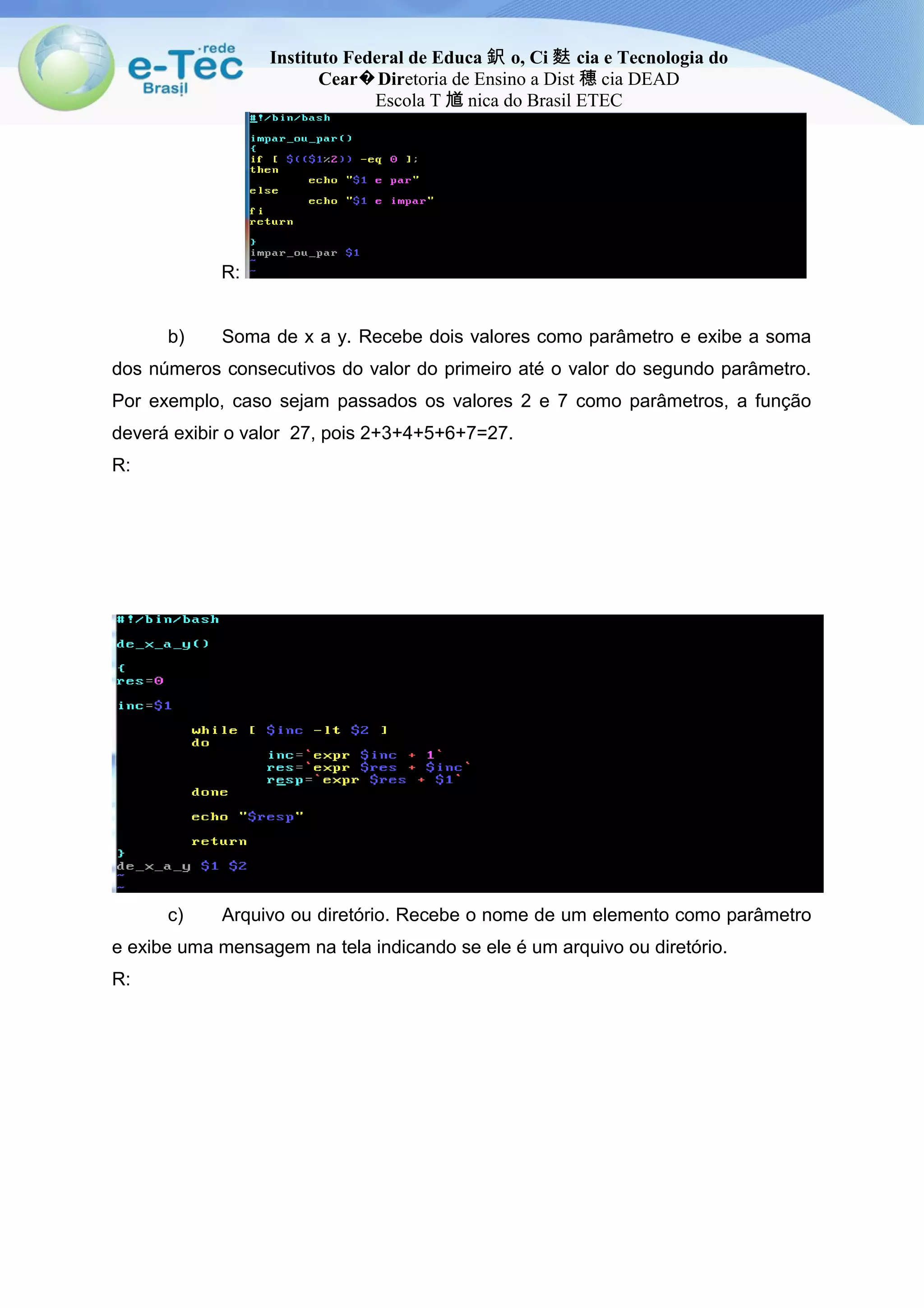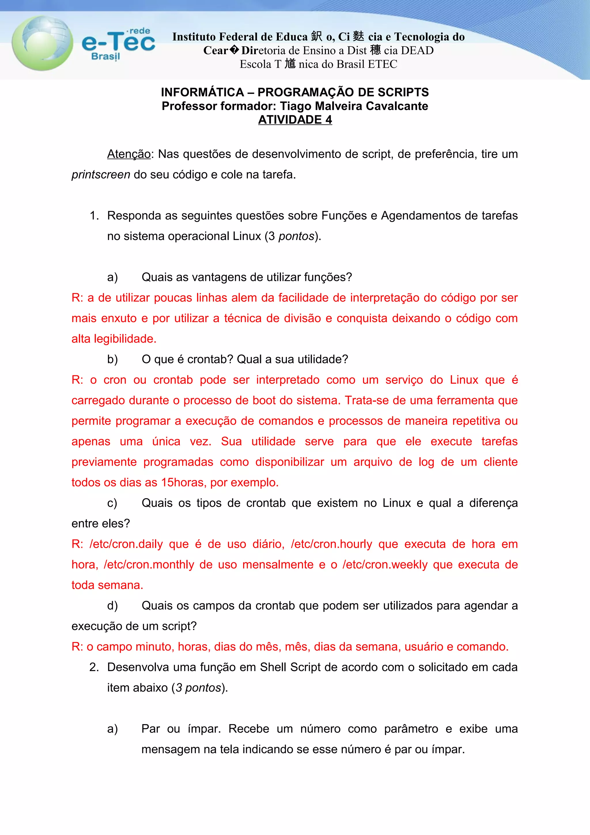 O documento apresenta uma atividade sobre programação em Shell Script com questões sobre funções, crontab e agendamento de tarefas no Linux. O estudante deve desenvolver funções para verificar se um número é par ou ímpar, calcular a soma de números consecutivos e identificar se um elemento é arquivo ou diretório. Além disso, precisa indicar linhas de crontab para agendar a execução de um script em diferentes momentos e desenvolver uma função para calcular o fatorial de um número.