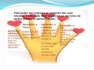 O documento discute três obstáculos para a educação - o currículo ultrapassado, professores sem capacitação adequada para novas tecnologias, e metodologias que não acompanham os novos caminhos do ensino. Ele também apresenta quatro pilares da educação segundo Delors e sete saberes essenciais para a educação do futuro de acordo com Morin.