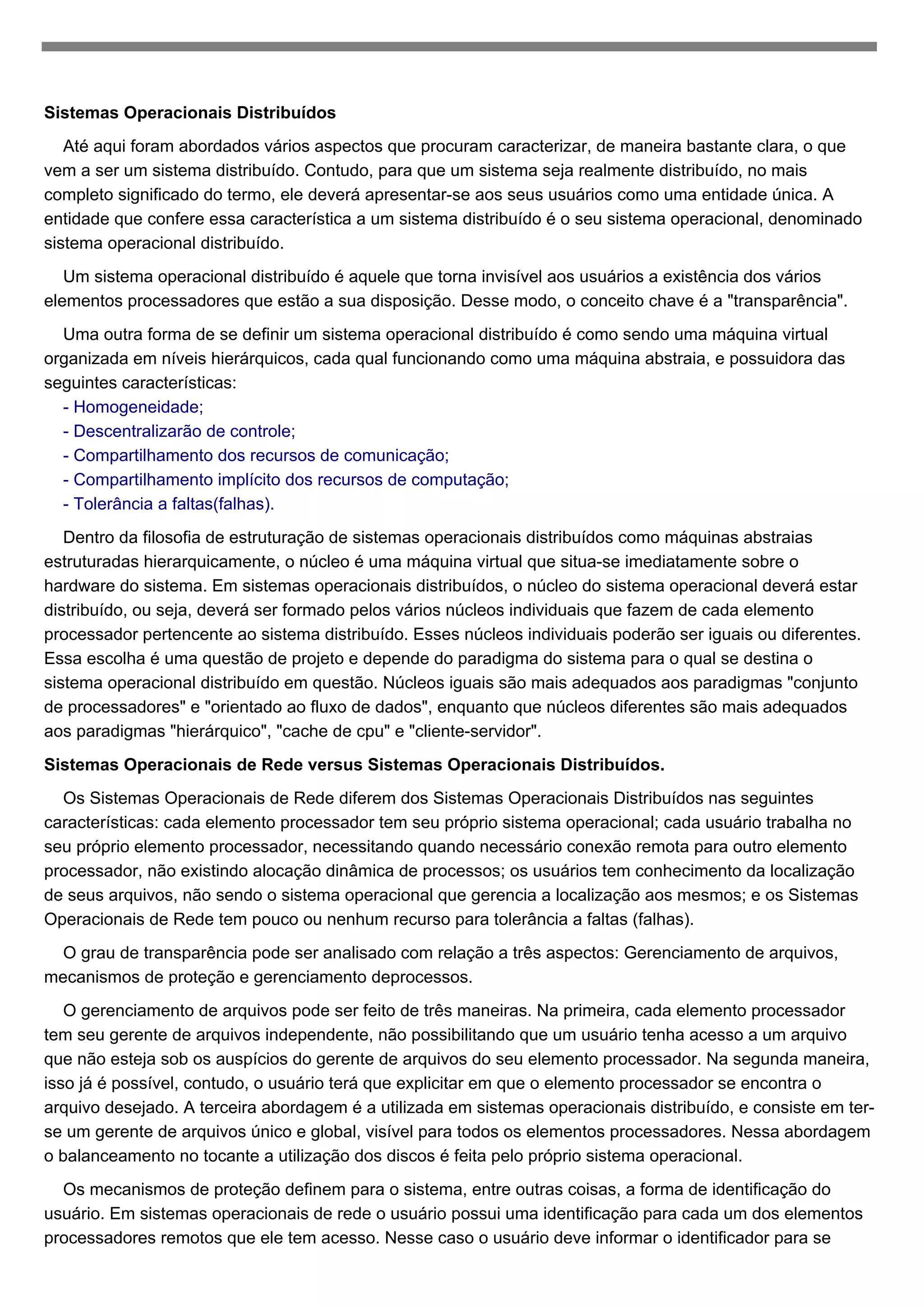Um sistema operacional distribuído torna os vários processadores de um sistema invisíveis aos usuários, apresentando-se como uma única entidade através da transparência. Ele é organizado em níveis hierárquicos de máquinas abstratas com características como homogeneidade, descentralização e compartilhamento de recursos. Diferentemente, sistemas operacionais de rede mantêm sistemas operacionais locais separados em cada processador e requerem que usuários especifiquem localizações.