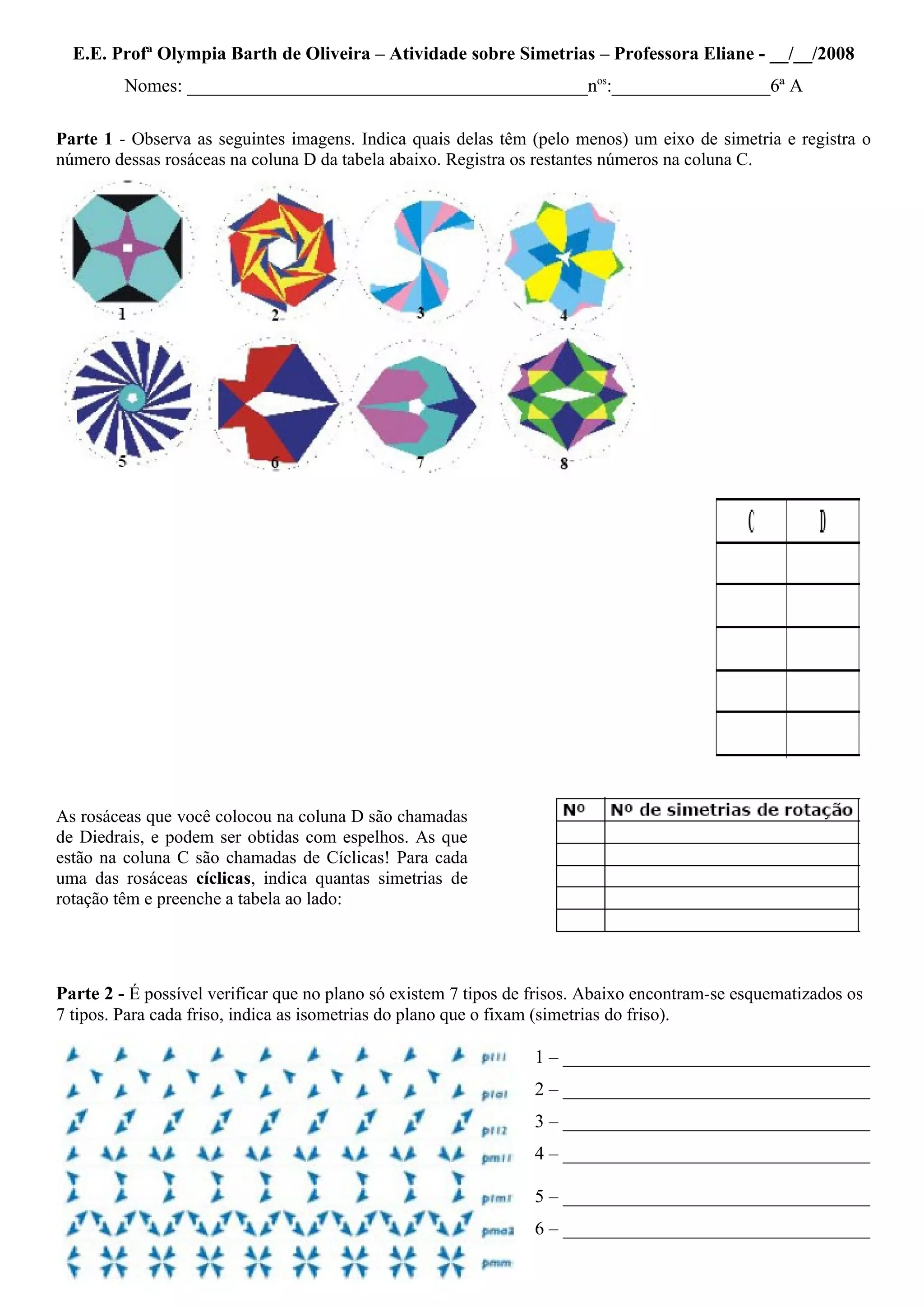 Este documento apresenta um conjunto de atividades sobre simetrias para estudantes do 6o ano A. A primeira atividade pede aos estudantes para identificar quais figuras têm eixos de simetria e quantas rotações têm as figuras cíclicas. A segunda atividade pede para identificar as isometrias que fixam cada um dos 7 tipos de frisos. A terceira atividade pede para dobrar um quadrado e desenhar o que será visto após abrir.