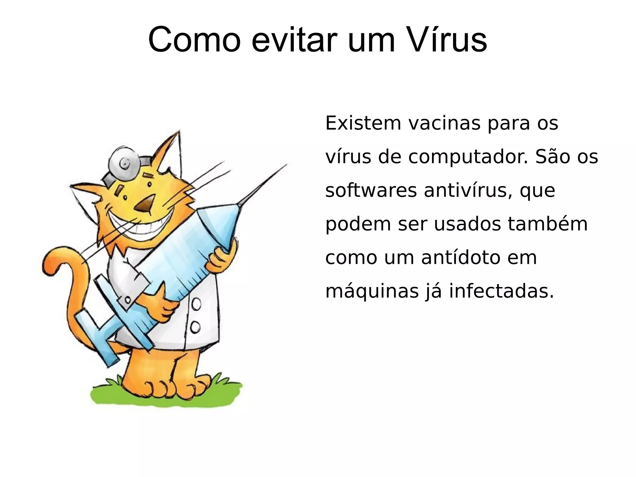 Softwares antivírus são as vacinas para vírus de computador e podem ser usados para desinfectar máquinas já infectadas. É importante manter o sistema operacional e programas atualizados e não abrir arquivos anexos suspeitos, especialmente de origens desconhecidas.