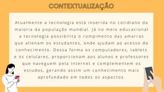 O documento discute os benefícios do uso de celulares nas escolas como recurso pedagógico, incluindo acesso a recursos online, construção de conhecimento interdisciplinar e compartilhamento de conhecimento. Também aborda as consequências da proibição do uso de celulares, como alienação dos alunos e falta de preparação para o mercado de trabalho. Defende que celulares podem auxiliar os professores, em vez de substituí-los, e que as escolas precisam avaliar a relevância de seus currículos.