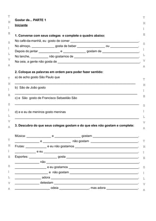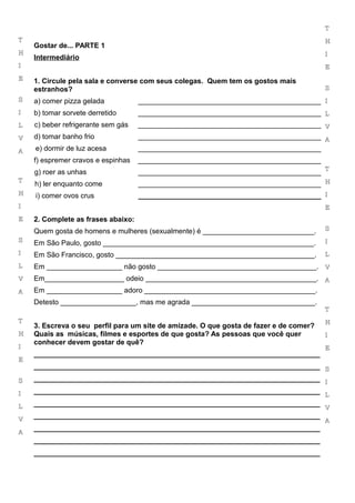 O documento é um exercício interativo sobre gostos e preferências, dividido em três níveis: iniciante, intermediário e avançado. Inclui atividades como preencher lacunas, ordenar frases, e criar perfis para um site de amizade. O objetivo é praticar a conversação e expandir o vocabulário em português.