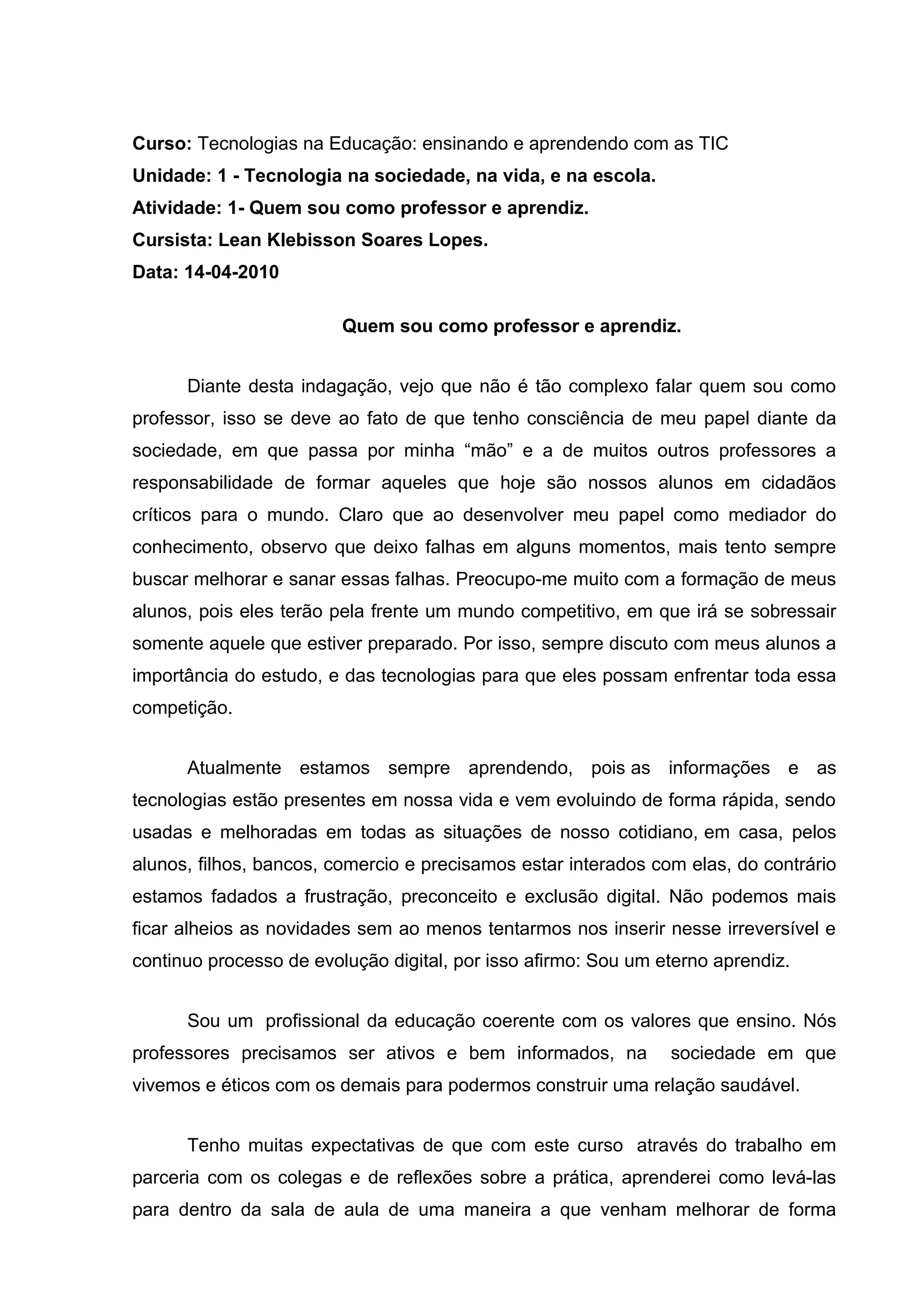 O documento descreve quem o autor é como professor e aprendiz. Ele se vê como responsável por formar cidadãos críticos e sempre busca melhorar sua prática docente. O autor também se vê como um aprendiz eterno porque as tecnologias e informações estão em constante evolução e é necessário estar sempre aprendendo. Ele acredita ser importante estar bem informado para construir uma relação saudável com os alunos.