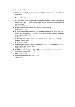 Este documento contém as respostas para exercícios de um capítulo sobre circuitos elétricos. As respostas incluem cálculos de tensão de pico, tensão CC, ondulação e PIV para circuitos com diodos, transformadores e filtros.
