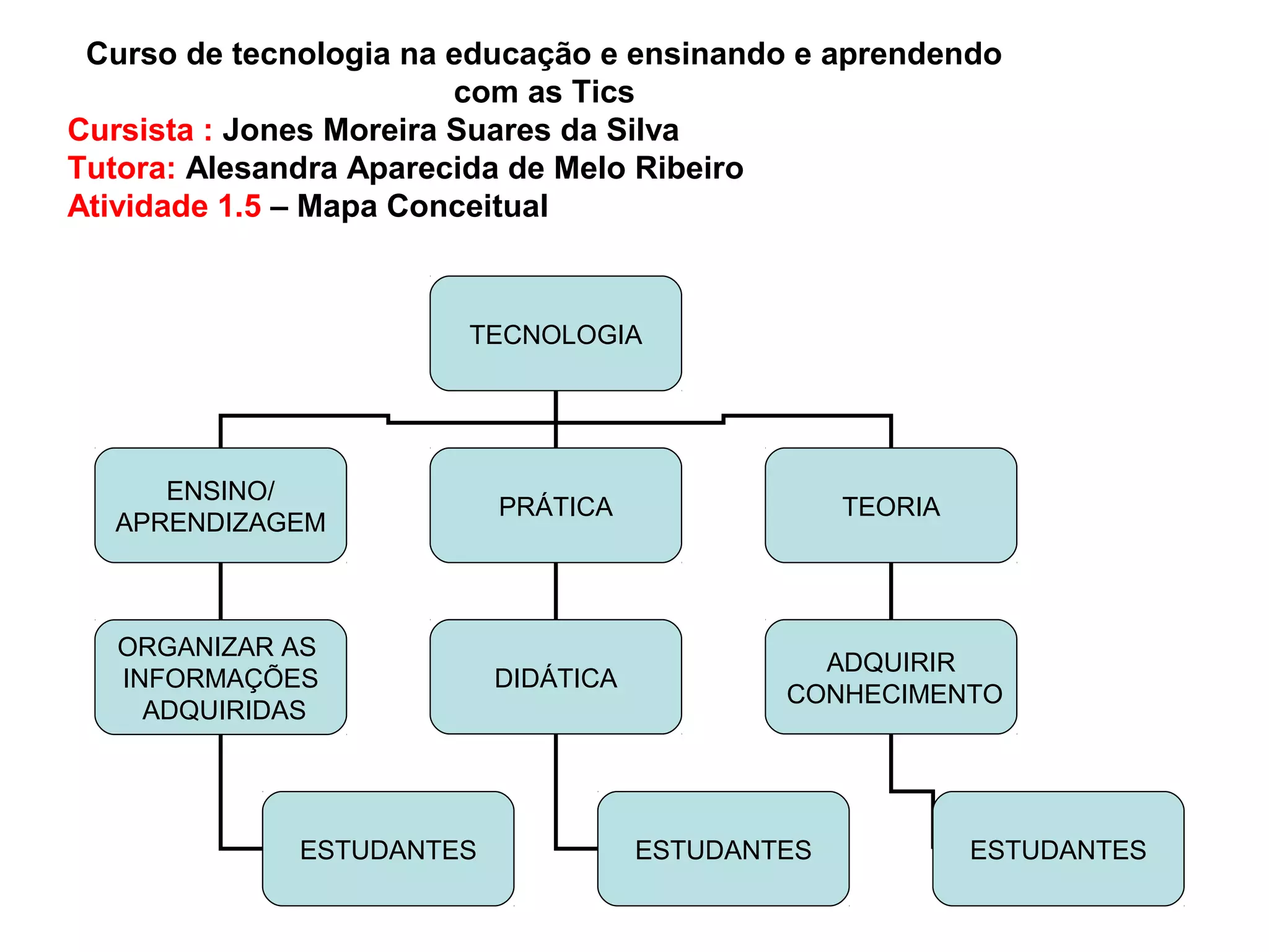 O documento apresenta um mapa conceitual sobre como a tecnologia pode ser usada para organizar informações adquiridas e adquirir conhecimento de forma prática e teórica, melhorando o ensino e a aprendizagem dos estudantes.