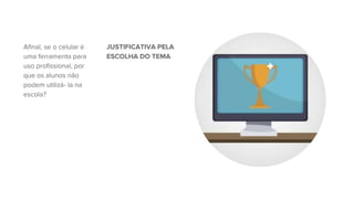 O documento discute os benefícios da inserção de computadores e celulares na escola como ferramentas didáticas que podem apoiar o aprendizado dos alunos. Ele lista vantagens como apoio ao professor, desenvolvimento da aprendizagem e democratização do acesso à tecnologia. Também aborda desafios como custos e falta de capacitação, e formas de utilizar esses dispositivos em modelos educacionais e para aprendizagem por descoberta.