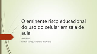 O documento discute os riscos educacionais do uso de celulares em sala de aula. Ele afirma que celulares desconcentram os alunos e impedem o aprendizado, citando uma pesquisa que mostrou que proibir celulares melhorou as notas dos alunos. Também argumenta que celulares podem impedir o amadurecimento dos alunos e comprometer seu futuro desempenho profissional. Defende a proibição do uso de celulares como política nacional para melhorar a qualidade das aulas.