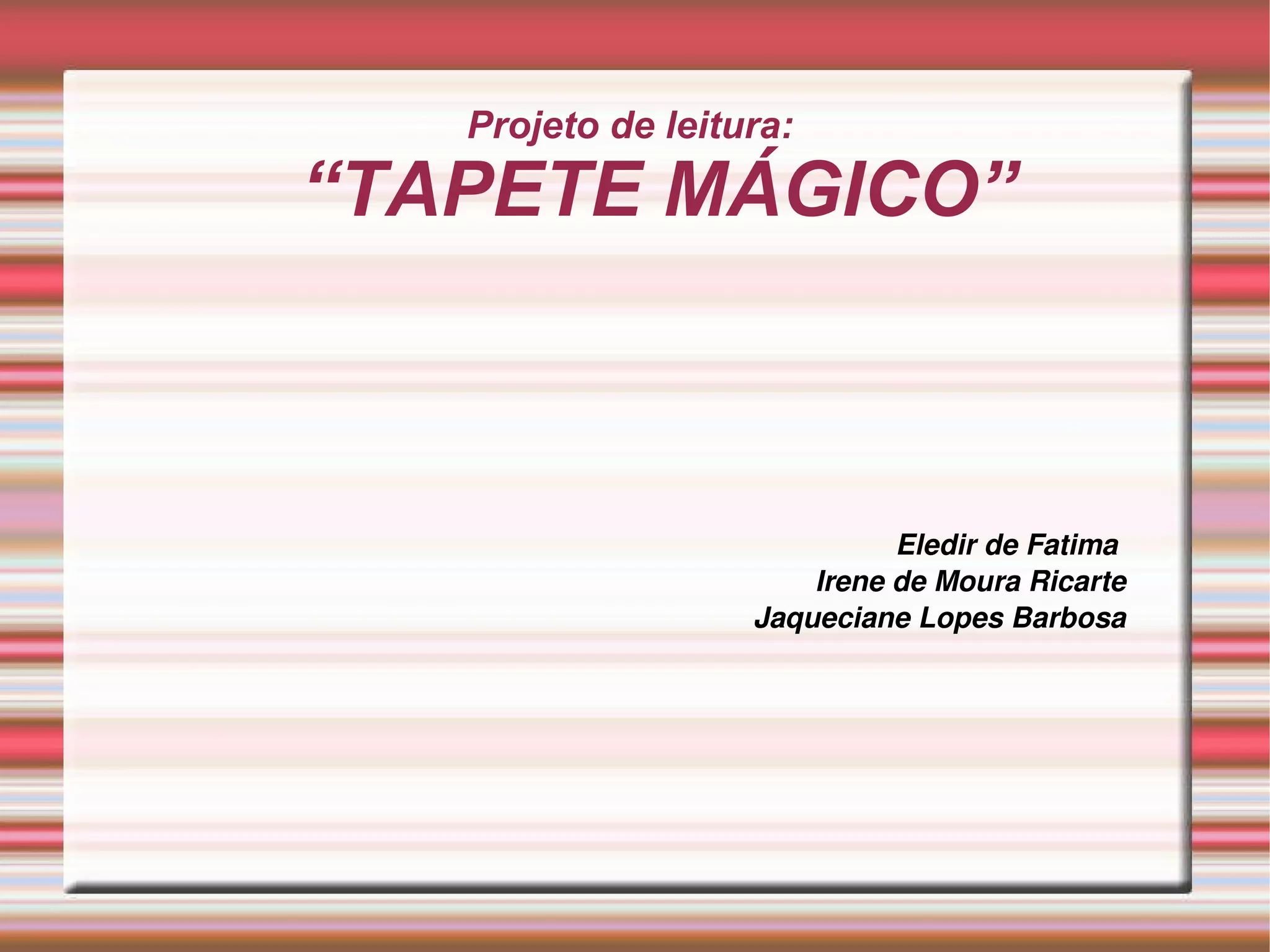 O projeto tinha como objetivo contar histórias infantis usando um tapete mágico e transformar o texto coletivo em um hipertexto. As etapas incluíram conversas, pesquisas, contação de histórias, criação de um texto coletivo e representações dos contos usando o tapete mágico e jogos. A avaliação ocorreu durante todo o projeto observando o desempenho individual e em grupo dos estudantes.