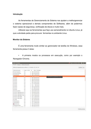 Este documento descreve ferramentas de gerenciamento de sistema no Ubuntu Linux, incluindo o Monitor do Sistema para visualizar processos e recursos, o XKILL para encerrar processos travados, uma ferramenta de cópia de segurança para backups e o FSCK para verificar e consertar sistemas de arquivos. O documento conclui enfatizando a importância de conhecer essas ferramentas para melhor gerenciar o sistema operacional e hardware do computador.